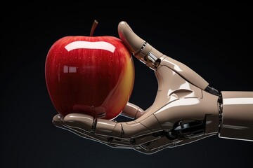 Robotic Hand Holds Drendered Apple, Symbolizing Automation And Gmo Concepts