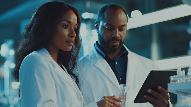 Modern Medical Research Laboratory: Portrait of Two Scientists Working, Using Digital Tablet, Analyzing Samples, Talking. Advanced Scientific Pharmaceutical Lab for Medicine, Biotechnology Development
