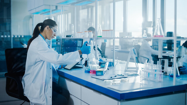 Modern Medical Research Laboratory: Female Scientists Working with Pipette, Using Digital Tablet, Analysing Biochemicals Samples. Scientific Medicine Lab, Microbiology Development. Advanced Equipment