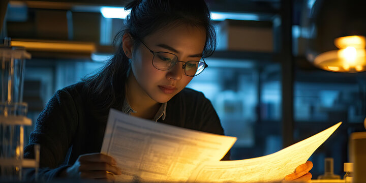 Persistent Researcher: A woman poring over pages of scientific data in a dimly lit lab.