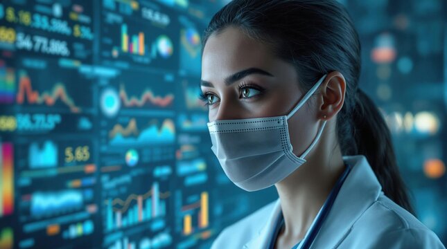Woman using vr headset with scientific data overlay