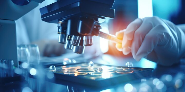 Laboratory Observation: A scientist meticulously examines a petri dish containing a vibrant blue solution under a microscope. This shot highlights the intricate nature of scientific research.