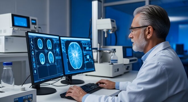 Focused scientist in white lab coat analyzing high-tech medical brain imagery on computer screen in modern laboratory with cool blue tones.
