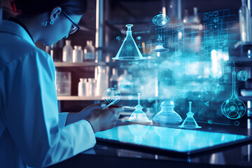 Scientist analyzing futuristic digital interface in a high-tech laboratory