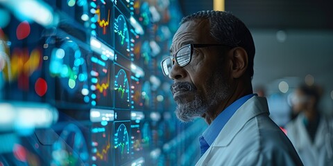A scientist observes a digital interface displaying complex data and analytics in a modern laboratory setting.