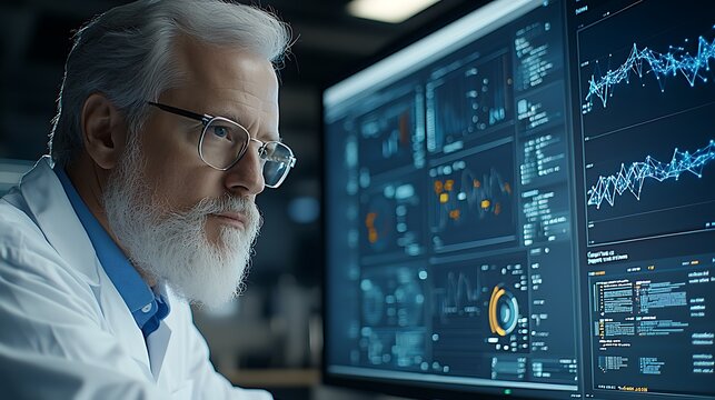 a scientist closely analyzing complex data on a computer screen in a laboratory setting