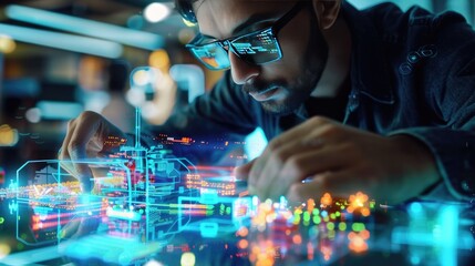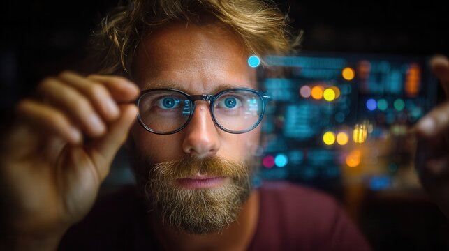 Intense scientist with glasses examining glowing futuristic data interface, revealing complex digital information with intense focus and curiosity.
