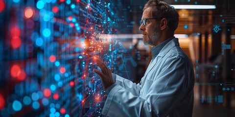 Scientist analyzing complex data on a futuristic digital interface with glowing red and blue connections in a high-tech laboratory