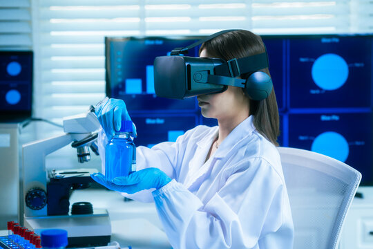 An Asian female scientist in a modern lab interacts with 3D holographic data using VR/MR headset, integrating microscopy, chemical analysis,computational biotechnology immersive, advanced scientific