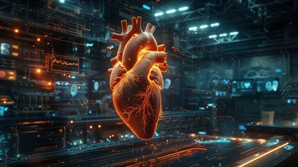 The facility features advanced displays focused on heart anatomy and medical research innovations in a futuristic environment.