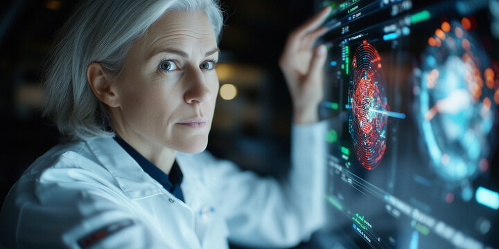 Female scientist analyzing data with advanced technology