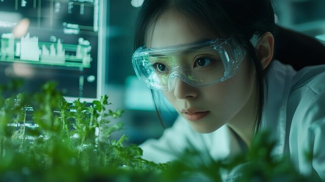 Focused scientist analyzing plant growth in advanced laboratory setting