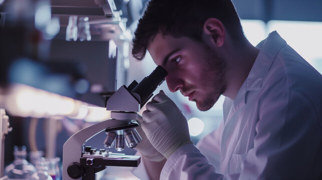 Dedicated scientist in a laboratory setting, wearing a lab coat and gloves, carefully examines samples using a microscope. The background features lab equipment and a computer screen