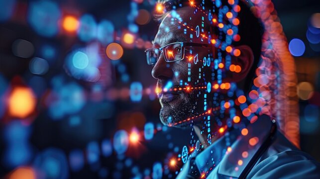 Futuristic concept of data analysis with a scientist in a lab coat and a digital interface overlay, representing technological advancement.