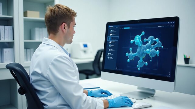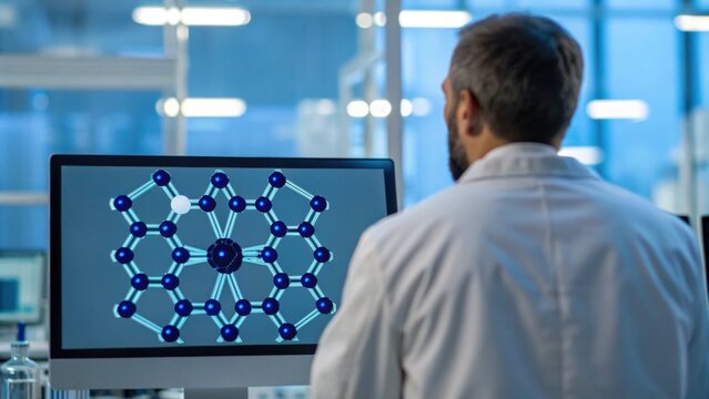 A scientist in a lab observes a molecular structure on a computer screen, illustrating advanced research in chemistry or materials science.