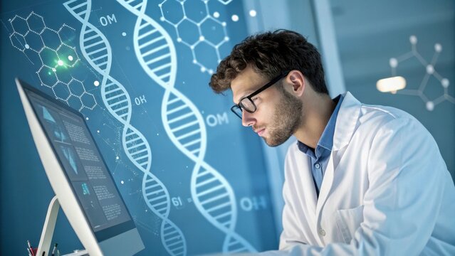 A focused scientist in a lab coat analyzes data on a computer, surrounded by DNA and molecular graphics, indicating research in genetics or biotechnology.