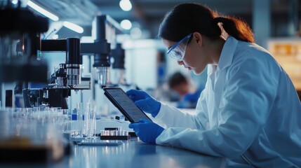 Scientist analyzing data on tablet in advanced laboratory