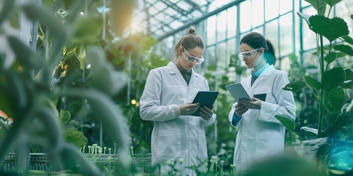 Two scientists in a greenhouse, wearing white lab coats, holding tablets, surrounded by lush green plants, engaged in scientific research and data collection.