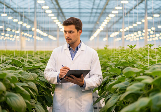 Focused agronomist in a white lab coat meticulously inspecting green plant crops and recording data on a tablet inside a modern greenhouse