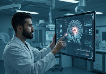 Male doctor or scientist in white lab coat, analyzing futuristic holographic display in modern laboratory. Transparent touchscreen showing glowing 3D digital model of human brain