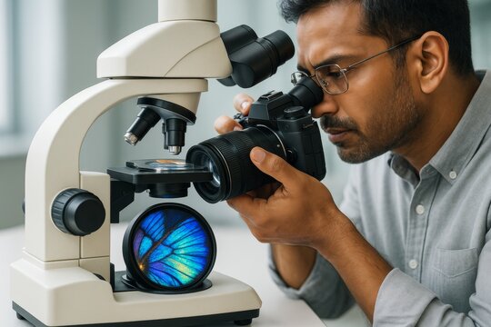 Scientist photographing butterfly wing through microscope in laboratory setting with soft light background, symbolizing science and discovery concept. Ai generative
