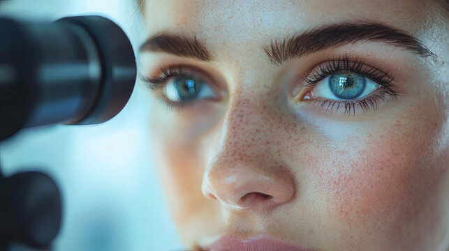 A focused female scientist intently examines a sample through a high-powered microscope in a modern laboratory setting.