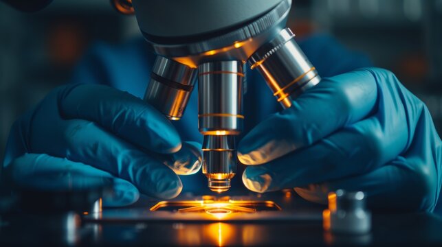 High-resolution scientific research laboratory scene featuring a scientist using a microscope for detailed analysis and discovery in a modern, well-equipped lab environment