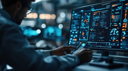 Scientist analyzing data on high-tech monitor in laboratory