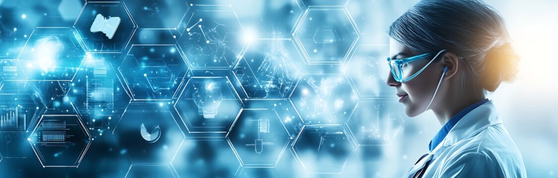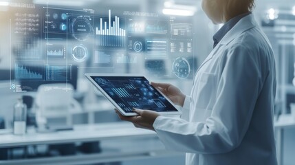 A scientist in a lab coat interacts with a futuristic digital interface, analyzing data and insights.