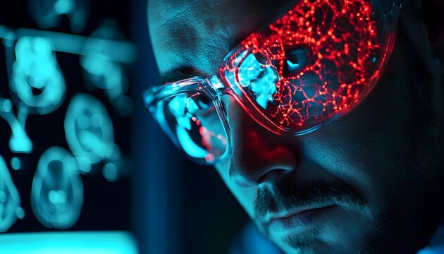 Close-up of a scientist looking at data on a screen, wearing futuristic glasses with a red neural network overlay.  High-tech research concept.