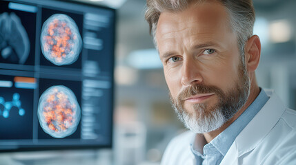 focused scientist in biomedical research station analyzes brain scans on computer screen. setting is modern and high tech, emphasizing importance of scientific research and innovation