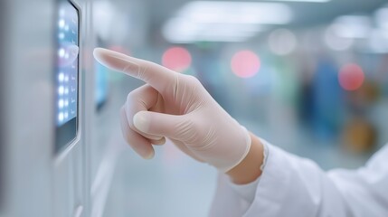 Scientist using transparent interface in protective gear