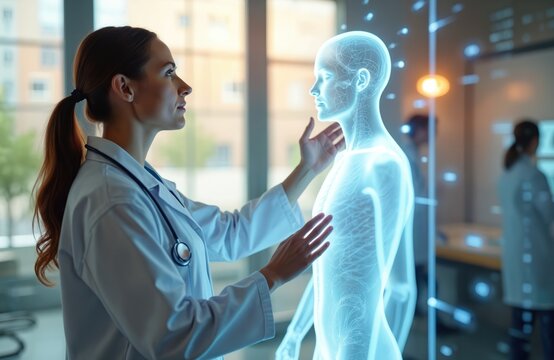 Doctor interacts with futuristic medical hologram display