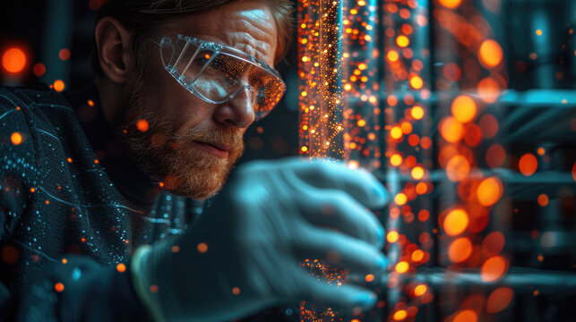A focused male scientist closely examines complex digital information on a futuristic transparent screen amidst the glowing ambiance of a modern laboratory.