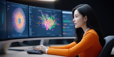 Data Scientist Analyzing Futuristic Interface with Charts, Graphs and Information on Transparent Digital Screens