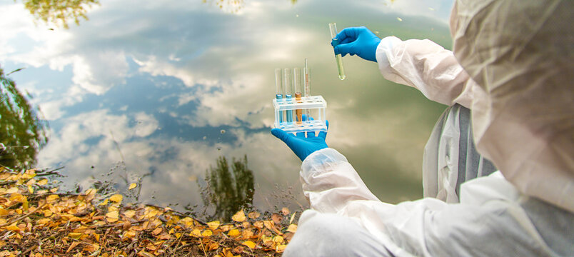 Take water samples for analysis. Selective focus.