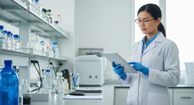 A tablet with a green screen sits on a laboratory table surrounded by glassware and scientific equipment. The setting is bright and modern, ideal for research.