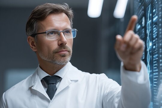 scientist in a lab coat analyzing a digital interface with DNA structure, futuristic medical technology, glowing touchscreen UI, sterile lab environment