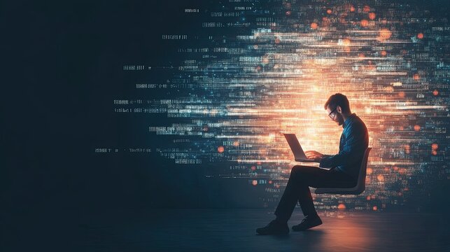 A scientist beams data from a high-tech lab instrument to a computer, their work illuminated by the glow of the monitors