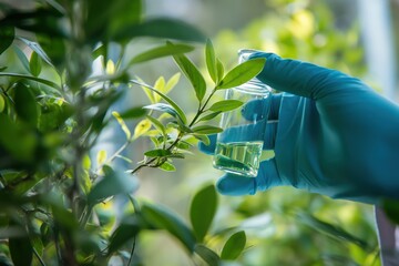 Scientist wearing blue gloves is holding a beaker with liquid analyzing a green plant for sustainable development