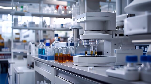 A sterile laboratory environment with high-performance liquid chromatography (HPLC) machines analyzing chemical samples.