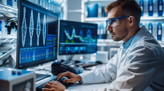 Scientist analyzing DNA data on computer in modern laboratory