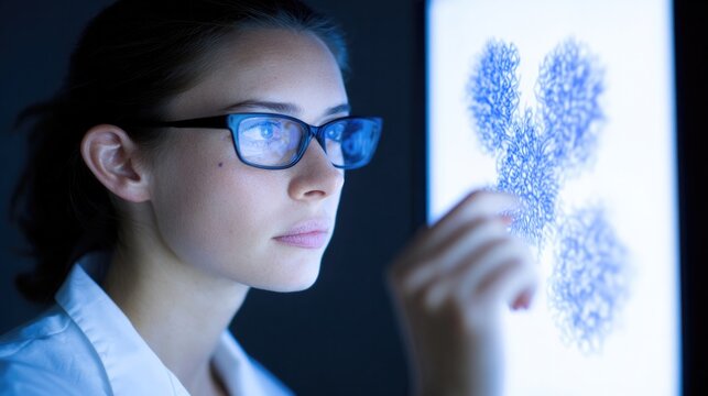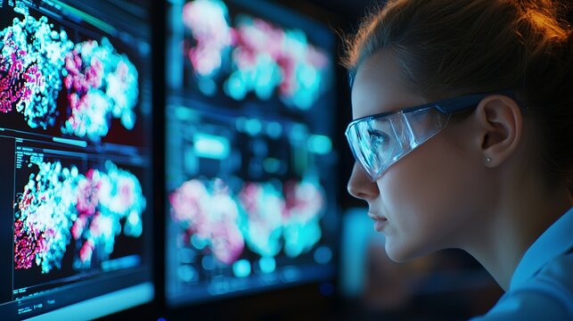 A scientist analyzes complex 3D molecular data on a high-resolution computer screen, working on a medical breakthrough in a modern, state-of-the-art laboratory.