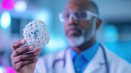 Scientist in a lab coat holding a 3D printed molecular model and analyzing it closely representing scientific research discovery innovation and progress in the field of chemistry or physics