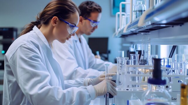 Two scientists analyzing samples in modern laboratory