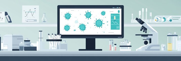 Modern laboratory workspace with microscopes, test tubes, and digital bacteria visuals displayed on monitor. Generative AI