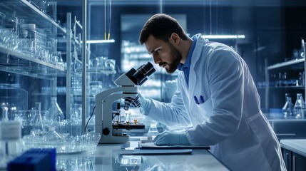 scientist in a lab coat analyzing samples under a microscope in a modern laboratory, copy space