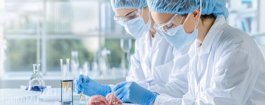 Two scientists working in a laboratory, analyzing samples with precision in a clean, high-tech environment.