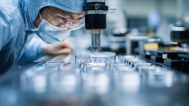Scientist in protective suit carefully examining samples under a microscope in a modern laboratory, conducting quality control and research