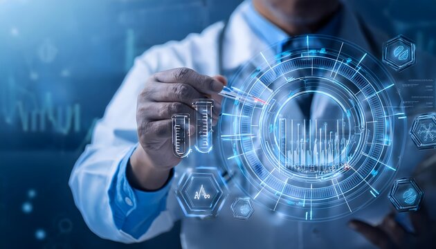 Scientist examining blood sample with digital interface overlay